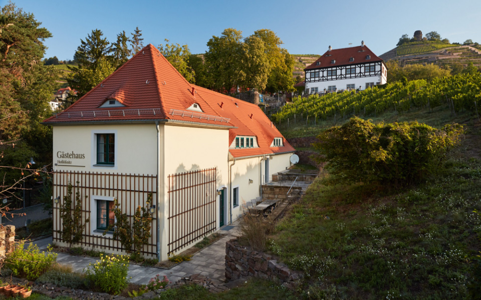 Unterhalb des historischen Ensembles der Hoflößnitz befindet sich inmitten der Weinberge ein Winzerhaus, dessen Ursprünge bis in das 17. Jahrhundert zurückgehen. Hier können sich unsere Gäste in dem liebevoll restaurierten Gebäude auch über Nacht wohlfühlen.