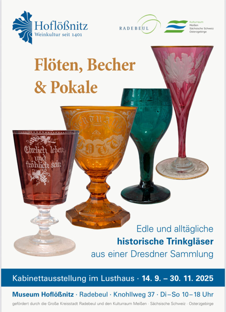 Zum „Tag des offenen Denkmals“ 2025 am Sonntag, den 14. September, öffnet das Weinbaumuseum Hoflößnitz in Radebeul, Knohllweg 37, traditionsgemäß bei freiem Eintritt seine Türen. Aus diesem Anlass startet die neue Kabinettausstellung „Flöten, Becher & Pokale – edle und alltägliche historische Trinkgläser aus einer Dresdner Sammlung“ in der Tafelstube des Lust- und Berghauses. Zur Eröffnung um 11 Uhr stellt sich der Sammler und Leihgeber Klaus-Dieter Wallis den Fragen der Gäste. Gleichzeitig besteht am Sonntag zum letzten Mal Gelegenheit, die im Bergverwalterhaus der Hoflößnitz gezeigte Ausstellung „Radebeul – Häuser & Landschaften. Aus der Grafiksammlung eines Denkmalpflegers“ zu besichtigen. Geöffnet ist vom 10 bis 18 Uhr.
